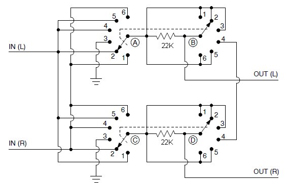 Note: The 22K resistors make it so that the system will not sound louder when in Mono. (They are used only in full Mono mode, switch position 4).